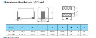GNL1210J221贴片电感的尺寸:长:3.2±0.3mm,宽:2.5±0.2mm,高:3.2±0.2mm,焊盘宽:0.6±0.2mm,焊盘长:2.0mm。如下图: