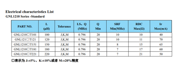 GNL1210J221贴片电感的参数:感值:22uH±5%,阻值:21mΩ,电流50mA。如下图: